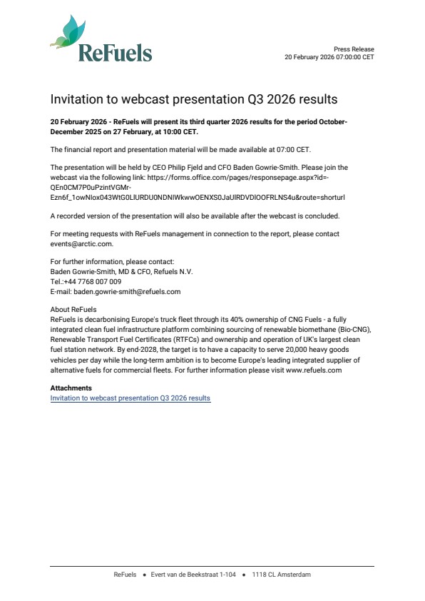 20 February 2026 – ReFuels will present its third quarter 2026 results for the period October-December 2025 on 27 February, at 10:00 CET.
