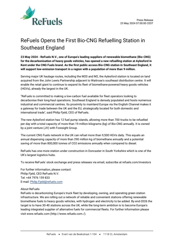 ReFuels is decarbonizing Europe's truck fleet by developing, owning, and operating green station infrastructure. We are rolling out a network of reliable and convenient stations offering renewable biomethane fuels to heavy goods vehicles, with hydrogen and electricity to be added. By end-2026 the target is to have 30-40 stations across the UK, while the long-term ambition is to become Europe's leading integrated supplier of alternative fuels for commercial fleets. For further information please visit www.refuels.com (http://www.refuels.com./).